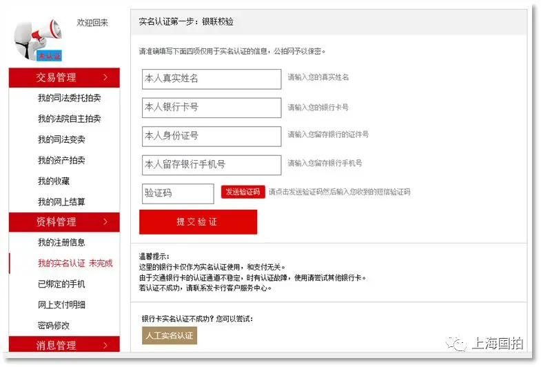 若银行卡无法完成校验,则用户选择人工实名认证后直接进入证照上传页面。由工作人员在24小时内进行审核。等待人工审核通过后方可参拍。
