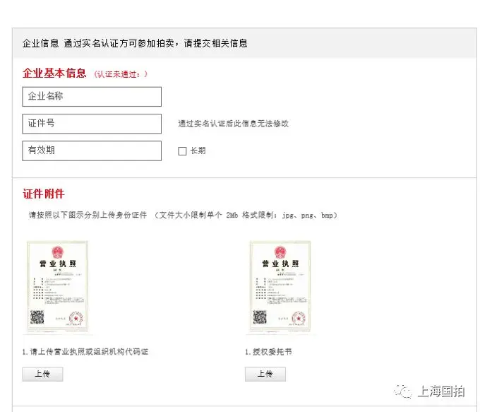 若银行卡无法完成校验,则用户选择人工实名认证后直接进入证照上传页面。由工作人员在24小时内进行审核。等待人工审核通过后方可参拍。